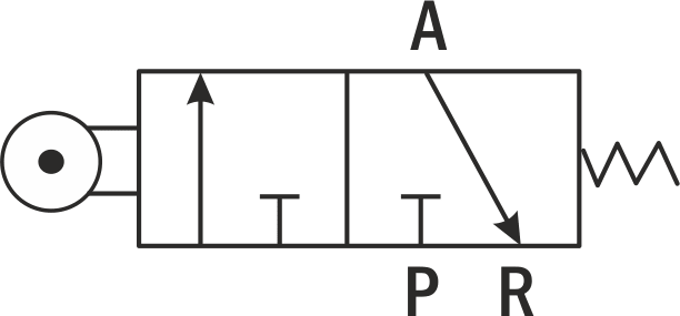 В исходном положении порт питания P перекрыт, рабочий порт А соединен с портом выхлопа R. При нажатии на ролик порт питания Р соединяется с рабочим портом А, а порт выхлопа R перекрывается. При снятии нажима золотник под действием пружины возвращается в исходное положение.