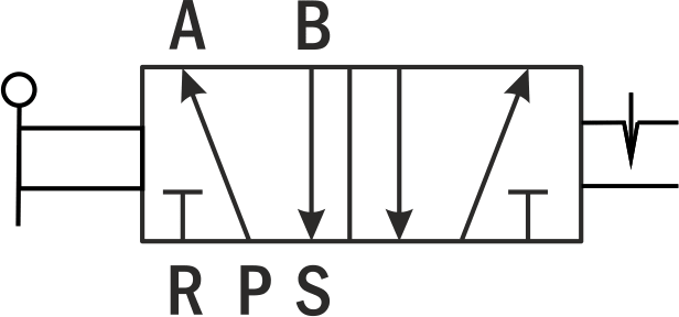 В исходном положении воздух подается через порт питания P на рабочий порт А, при этом рабочий порт В соединен с портом выхлопа S. При повороте рукоятки порт питания Р переключается на рабочий порт В, а рабочий порт А соединяется с портом выхлопа R. При возврате рукоятки в начальное положение золотник также возвращается в исходное положение.