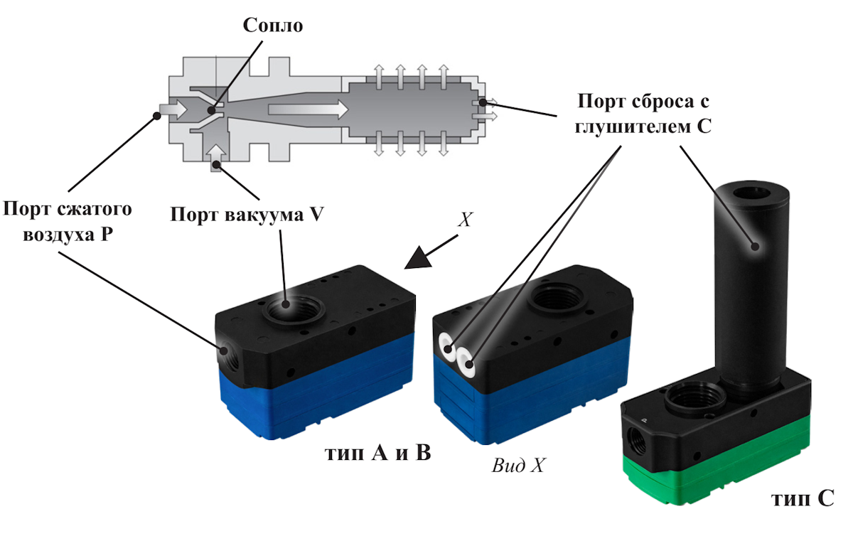 В основе работы эжектора лежит эффект Вентури. Сжатый воздух входит через порт Р и проходит через сопло. сразу за соплом возникает область падения давления (вакуум), что вызывает подсос воздуха через порт вакуума V. Втянутый и сжатый воздух смешиваются и удаляются от места всасывания энергией сжатого воздуха, а далее сбрасываются через порт сброса (выхлопа) С с внутренним или внешним глушителем
